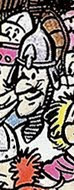 Na pierwszej planszy "Borostworów" Wit ponownie przysłuchuje się przemówieniu kasztelana (21), a w ostatnim rozdziale oddaje się zbiorowym lamentom z powodu braku wody (22). Ta scena jest w ogóle niezrozumiała, bo brak wody był w PRL-u rzeczą normalną i nikt z tego powodu nie rozpaczał, tylko grzecznie chodził na kąpiele do rodziny. Na stronie 7 pojawia się postać, która mogłaby być Witem, posiada bowiem bardzo podobny szyszak (C). No właśnie - podobny, ale nabijany nitami, czyli jednak nie identyczny. Poza tym na nogach brakuje mu kolczugi. W zagadce wyraźnie zaznaczyliśmy, że Wit bez żadnej wątpliwości musi być rozpoznawalny, a tu twarz zakryta jest żurawiem. Ponieważ oprócz nauszników i paska nic się nie zgadza, postać tę z żalem musieliśmy wykluczyć.